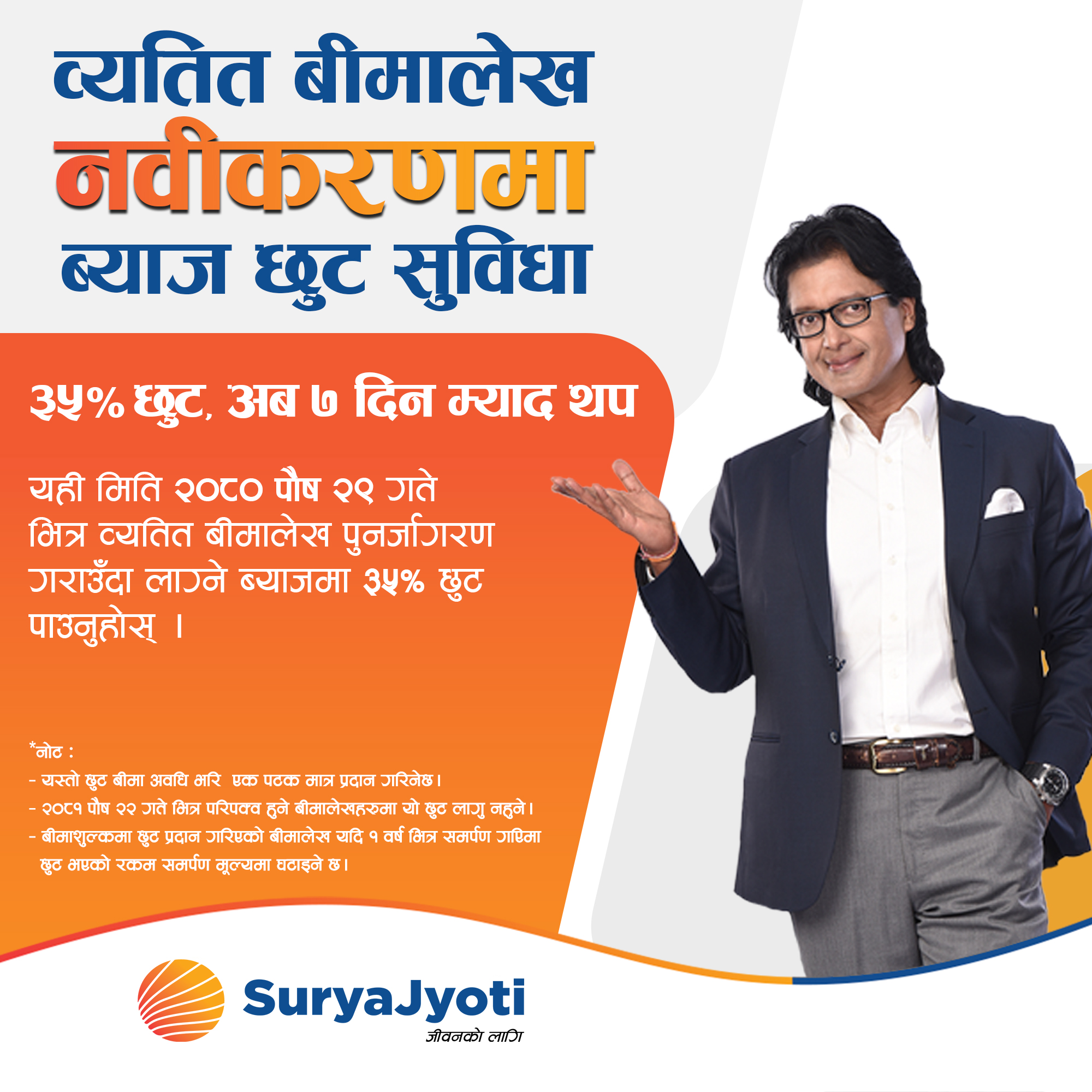 यस कम्पनीबाट जारी गरिएका व्यतित बीमालेख मिति २०८० पौष २३ गते देखि मिति २०८० पौष २९ गते भित्र नवीकरण गराउने बीमितहरुलाई लाग्ने ब्याजमा ३५% छुट प्रदान गरिने भएकोले यस अवसरको फाइदा उठाई बीमालेख सक्रिय बनाउनु हुन यो सूचना जारी गरिएको छ ।